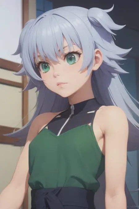 Sora tenkūji, gray hair, green eyes, bangs, messy hair, slim waist, slim body, small breast