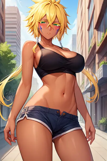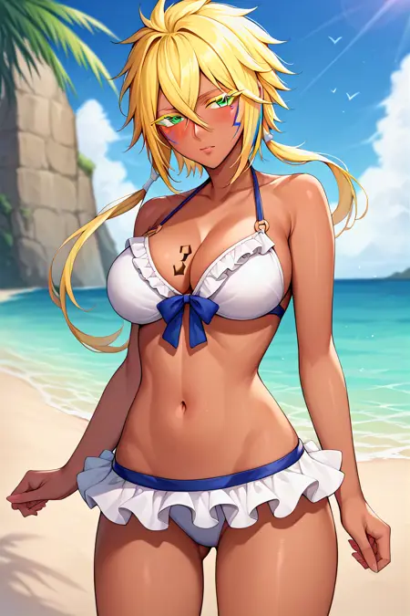 Trigger Words: ``tier harribel, dark skin, yellow hair, facial mark, green eyes, colored eyelashes``
