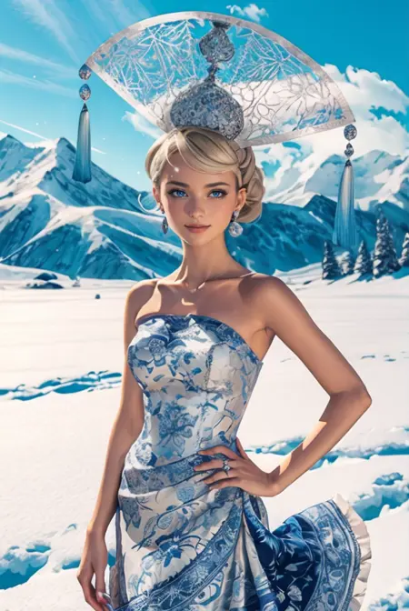 Prompt Keywords: HUD_ch1na, asymmetrical blue and white chinoiserie porcelain colored strapless dress, brocade, pleated ruffle skirt, bare shoulders, jewelry, earrings, ring, large intricate metal carved jeweled headdress with one tassel on each side