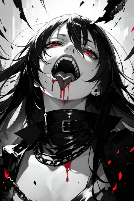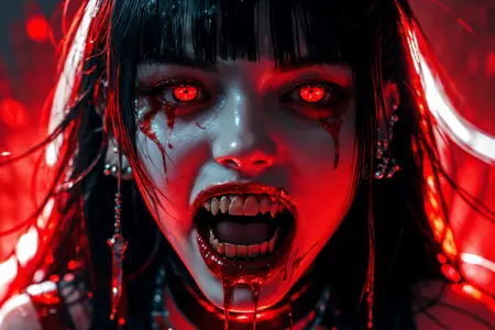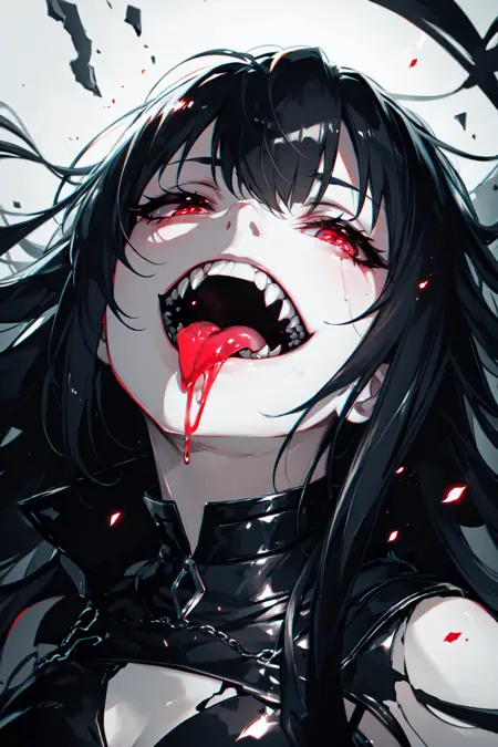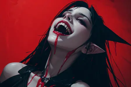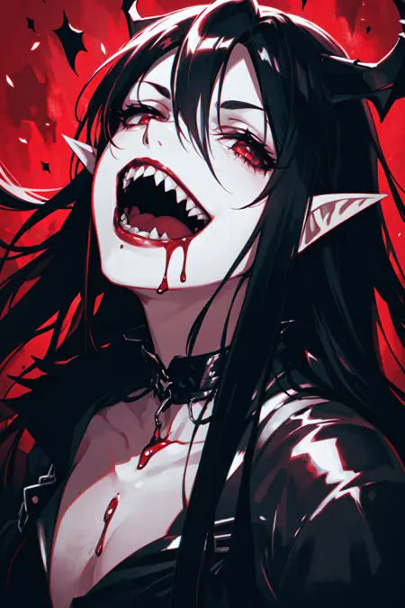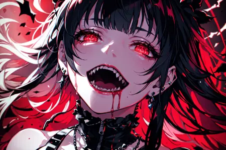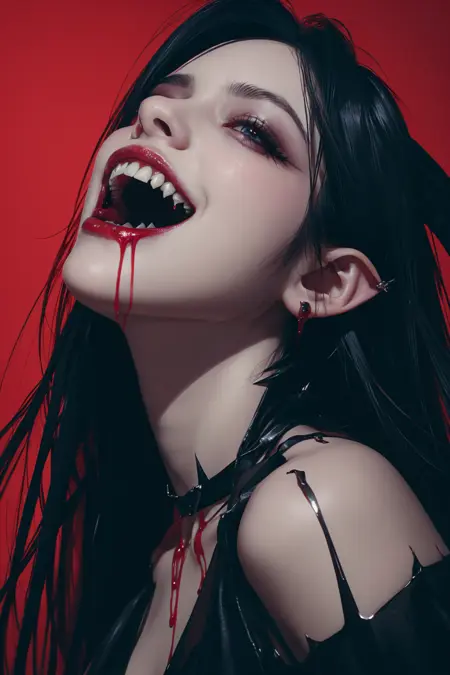 prompt: best quality,masterpiece,realistic,long hair,teeth,solo,blood,pointy ears,black hair,red background,open mouth,vampire,1girl,sharp teeth,blood on face,male focus,looking at viewer,