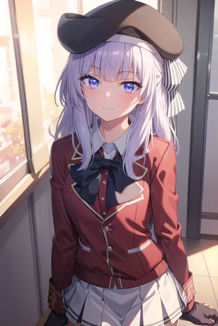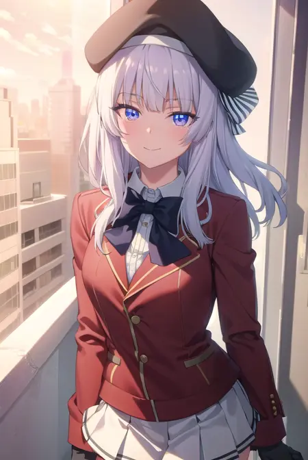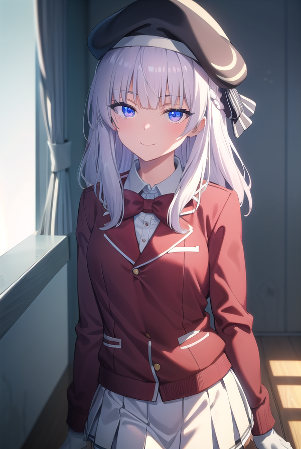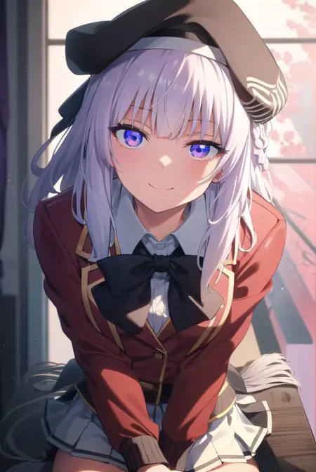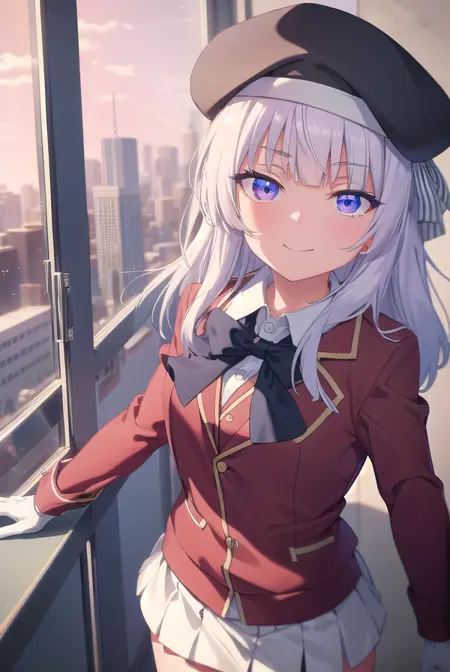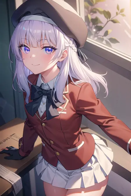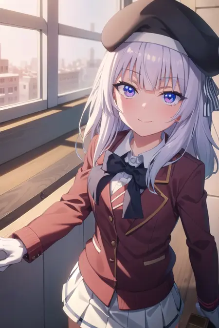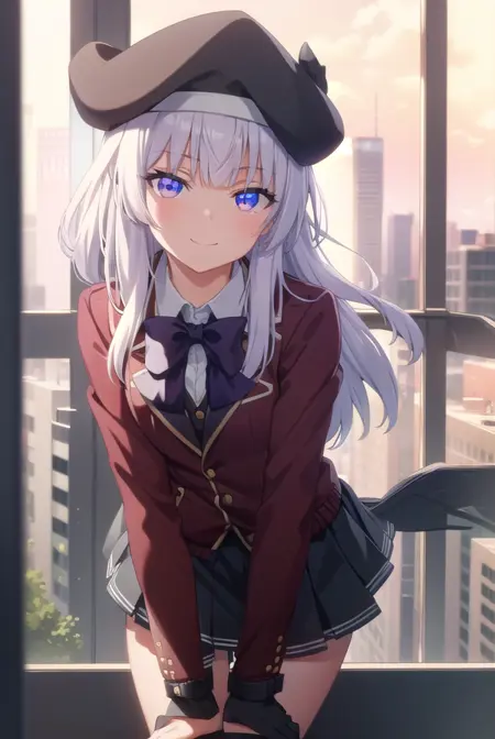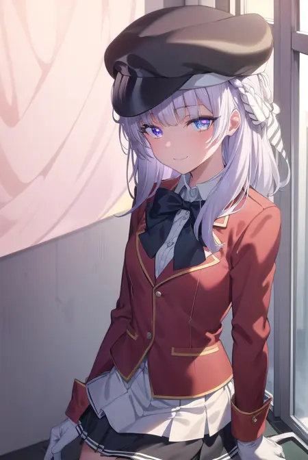 skirt, shirt, gloves, long sleeves, hat, bow, school uniform, jacket, white shirt, pleated skirt, collared shirt, miniskirt, bowtie, black headwear, black bow, beret, blazer, (white skirt:1.5), (red jacket:1.5), grey skirt, black bowtie,