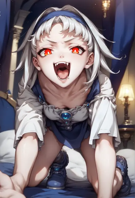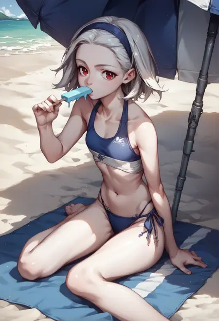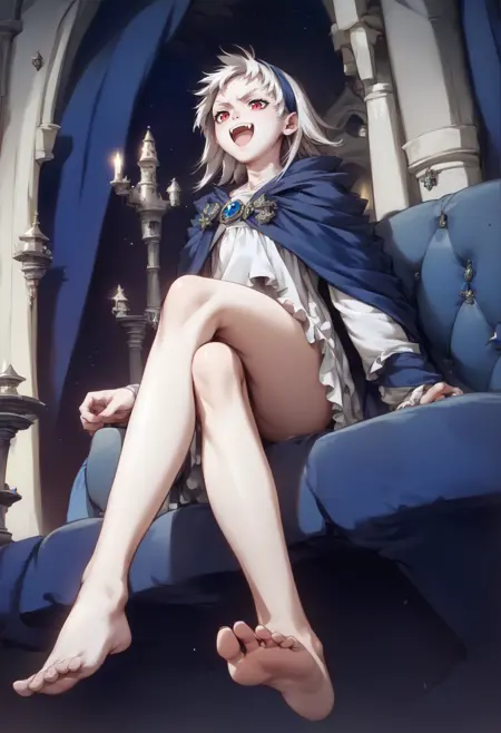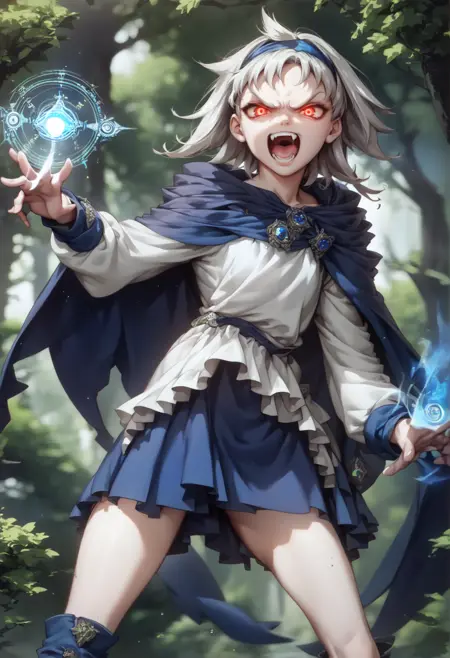 Notable tags: medium hair, white hair, red eyes, hairband, jewelry, white shirt, cape, skirt, blue skirt, thight boots,
