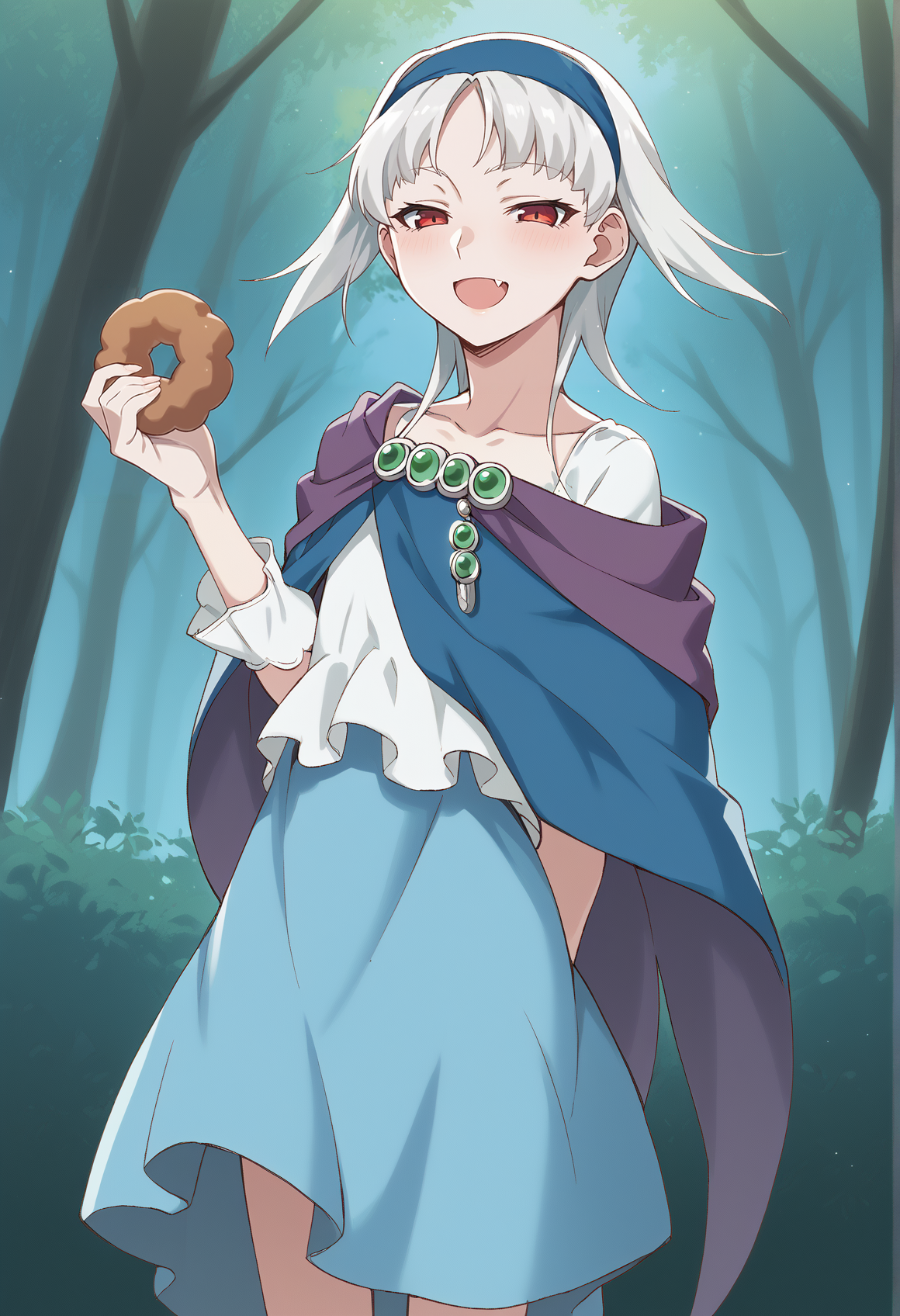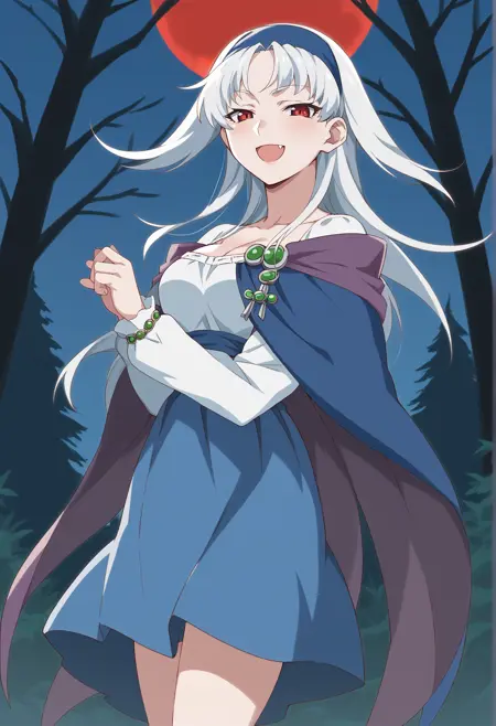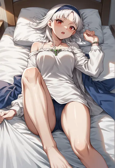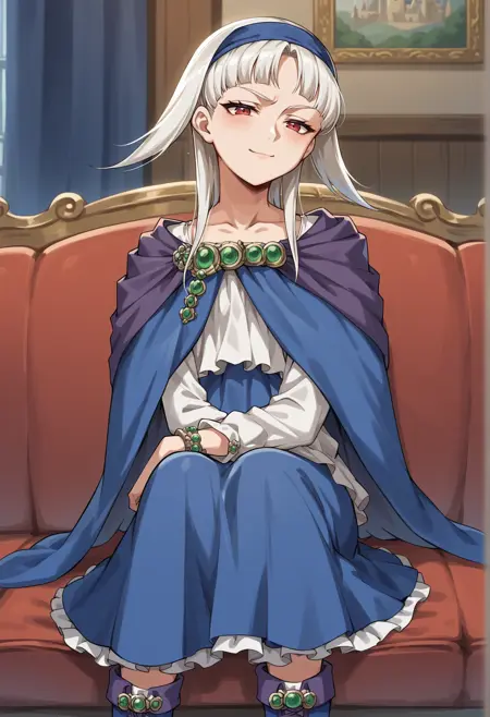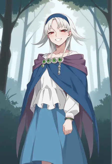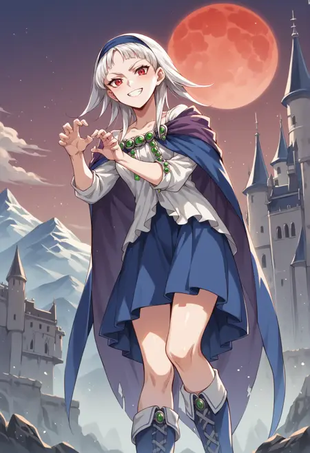 Notable tags: medium hair, white hair, red eyes, hairband, jewelry, white shirt, cape, skirt, blue skirt, thight boots,