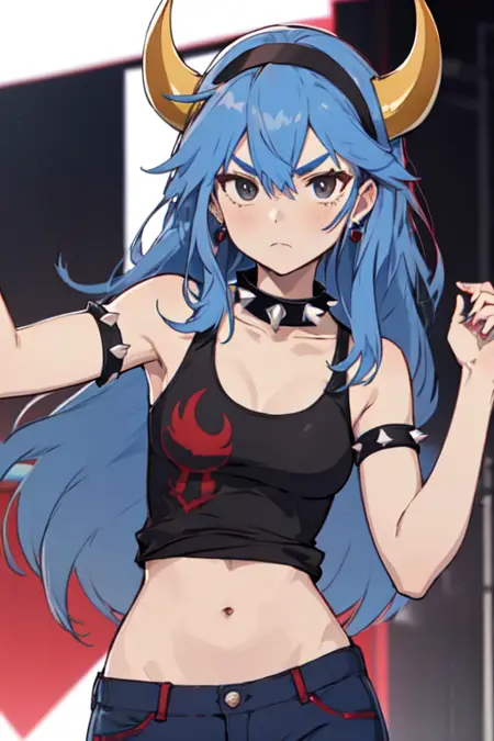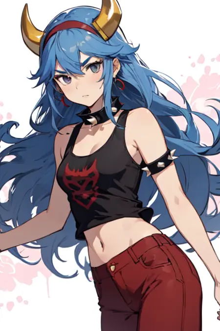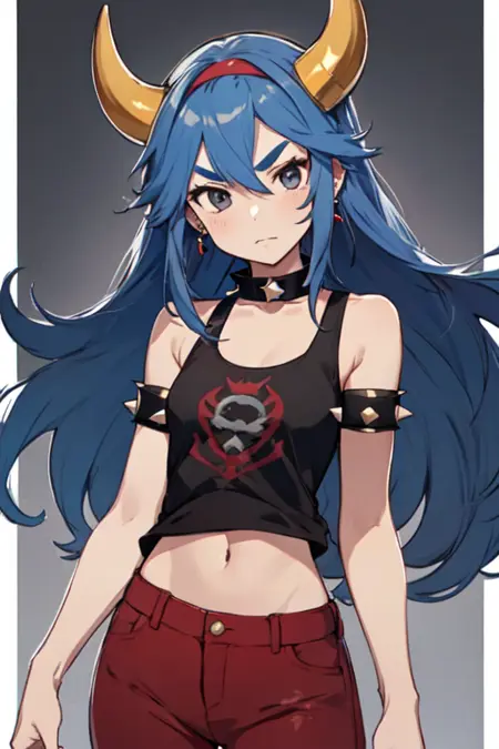 LucinaBowser, 1girl, solo, long hair, black tank top, bare shoulders, blue hair, horns, red pants, thick eyebrows, spiked collar, super crown, spiked shell, hairband, earrings, midriff, black eyes, armlet, spiked collar