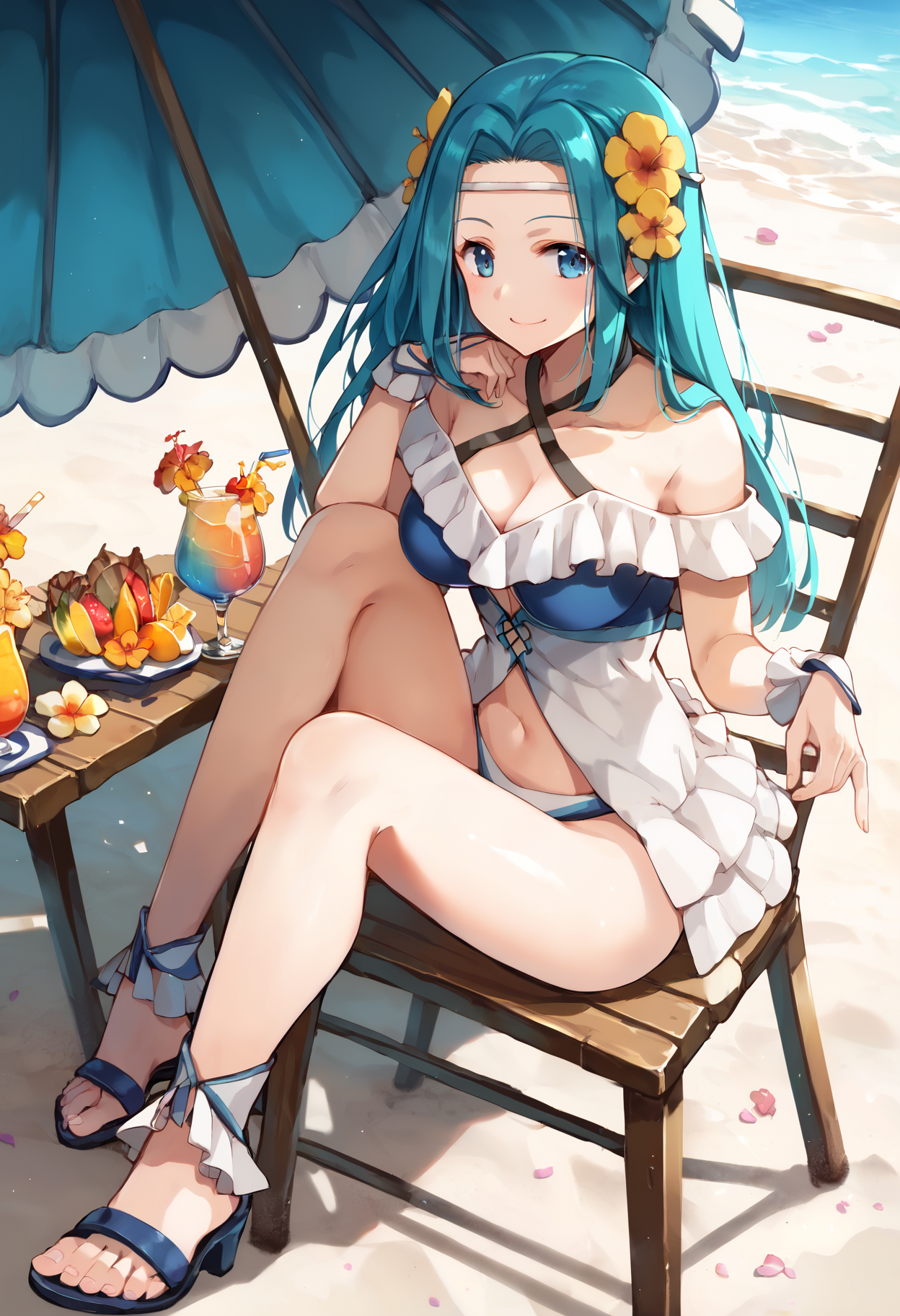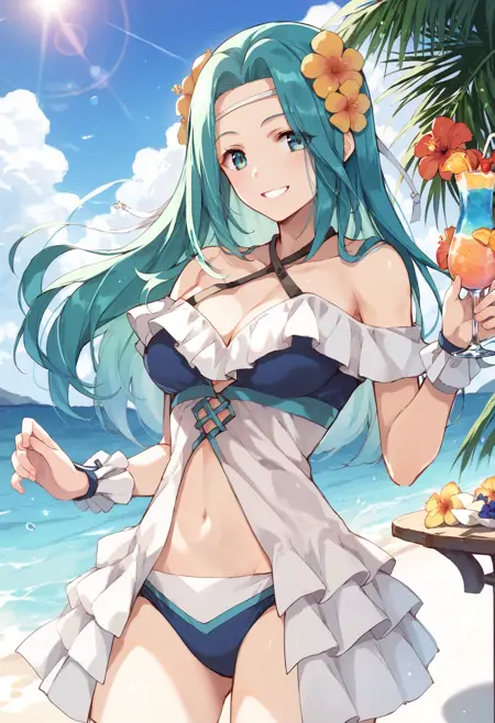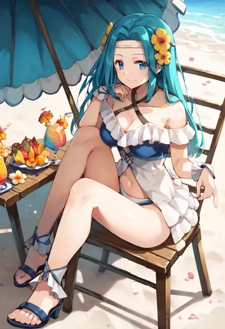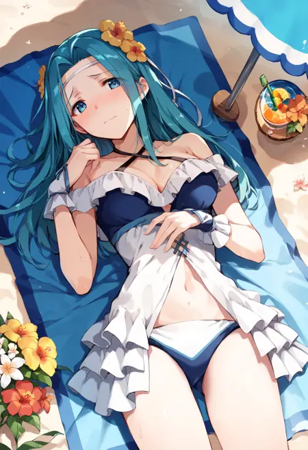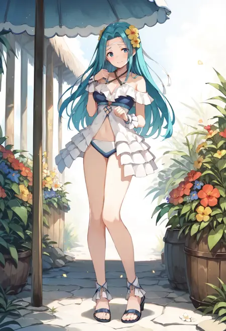Add "bikini,criss-cross halter,wrist cuffs,sandals" for her summer look.(summer_v1.0)