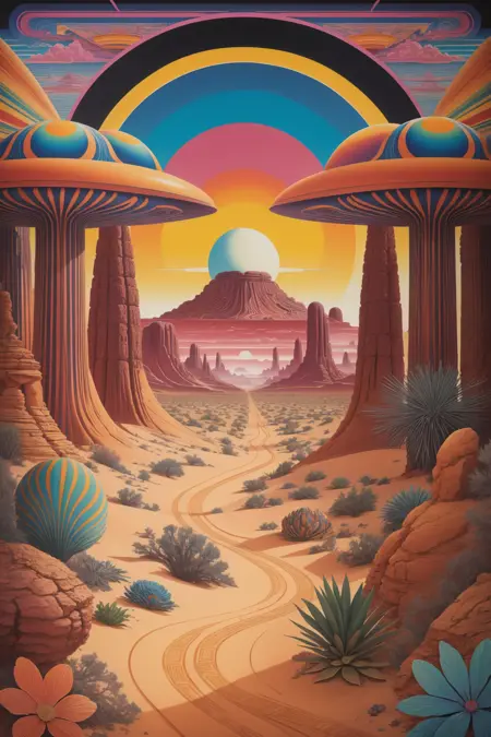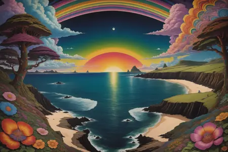 lora:psychedelic.landscape.PDXL\_epoch\_8:1psychedelic landscape, outdoors, colorful sky, {sunset, sun{, rainbow|}|sunrise, sun{, rainbow|}|night, dark sky, cosmic, {moon|planets}, stars}, clouds, flowers, mountains, {desert, cactus, sand|ocean, beach, trees, island, palms, reflection{, volcano|}|forest, trees, river, reflection{, volcano|}|snow, ice caps, lake, reflection|jungle, trees, vines, river{, volcano|}}
