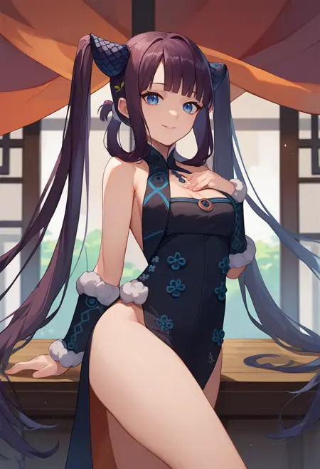 Second Ascension: yangst2, twintails, leaf hair ornament, black dress, side slit, thighs, arm warmers, bare shoulders, cleavage