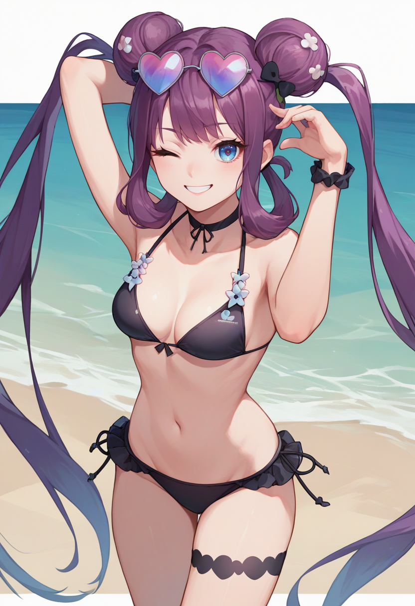 Honey Lake: yangswim, double bun, twintails, hair ornament, eyewear on head, heart-shaped eyewear, black bikini, choker