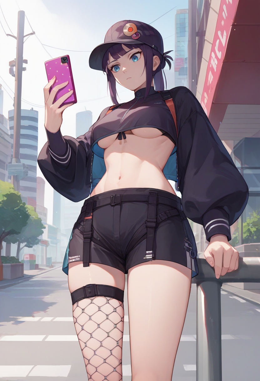 Heroic Spirit: yangheroic, baseball cap, black jacket, open jacket, long sleeves, crop top, underboob, black shorts, single thighhigh, fishnet thighhighs