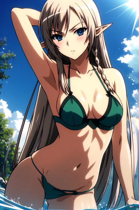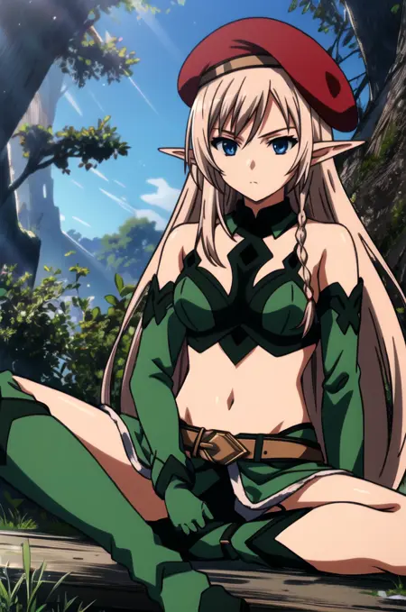 Basic Prompt: queen-alleyne, 1girl,elf, mature female, solo, long hair, blonde hair, blue eyes,medium breasts, pointy ears,green glove, green footwear,(red beret), red cape,