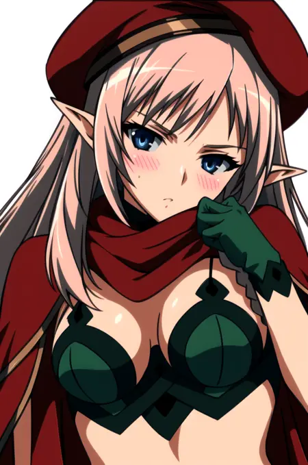 기본 프롬프트: queen-alleyne, 1girl, elf, 성숙한 여성, 혼자, 긴 머리, 금발, 파란 눈, 중간 크기의 가슴, 뾰족한 귀, 녹색 장갑, 녹색 신발, (빨간 베레모), 빨간 망토