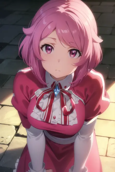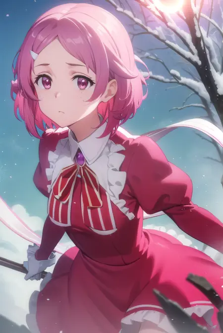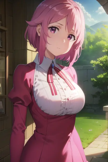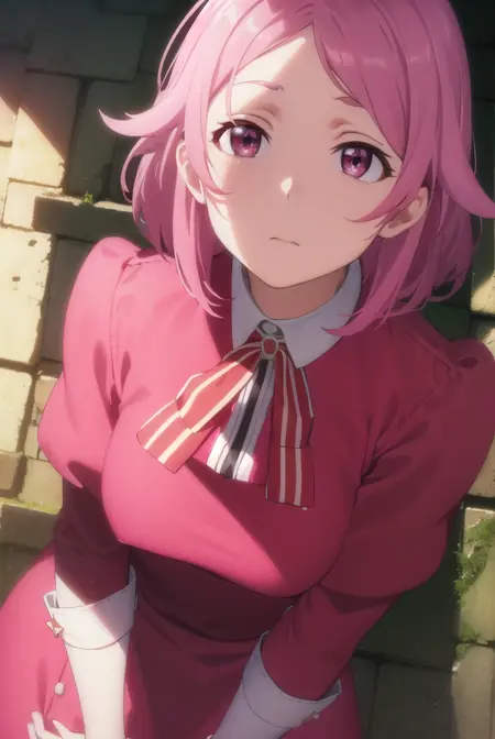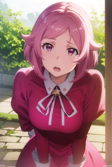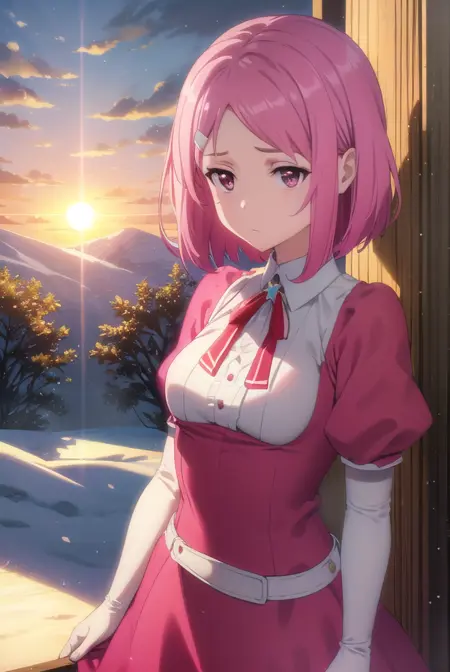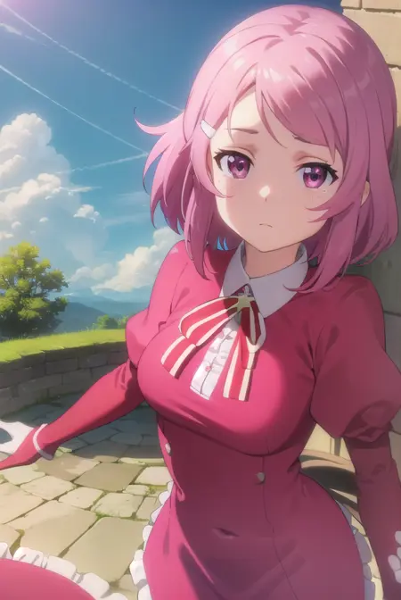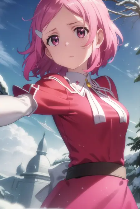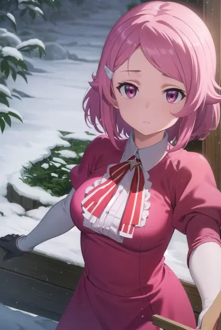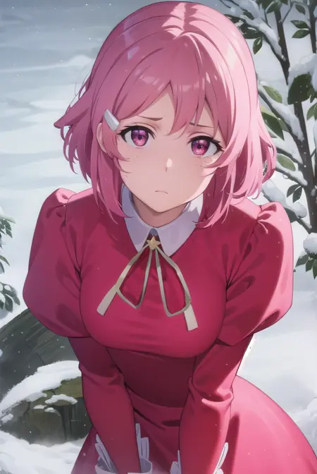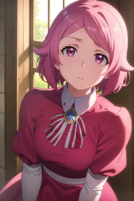 rika shinozaki, short hair, hair ornament, pink hair, hairclip, (pink eyes:1.3), freckles, (parted bangs:1.5),