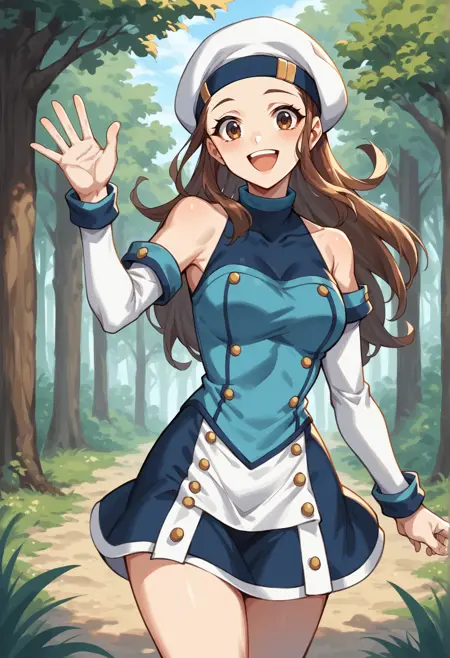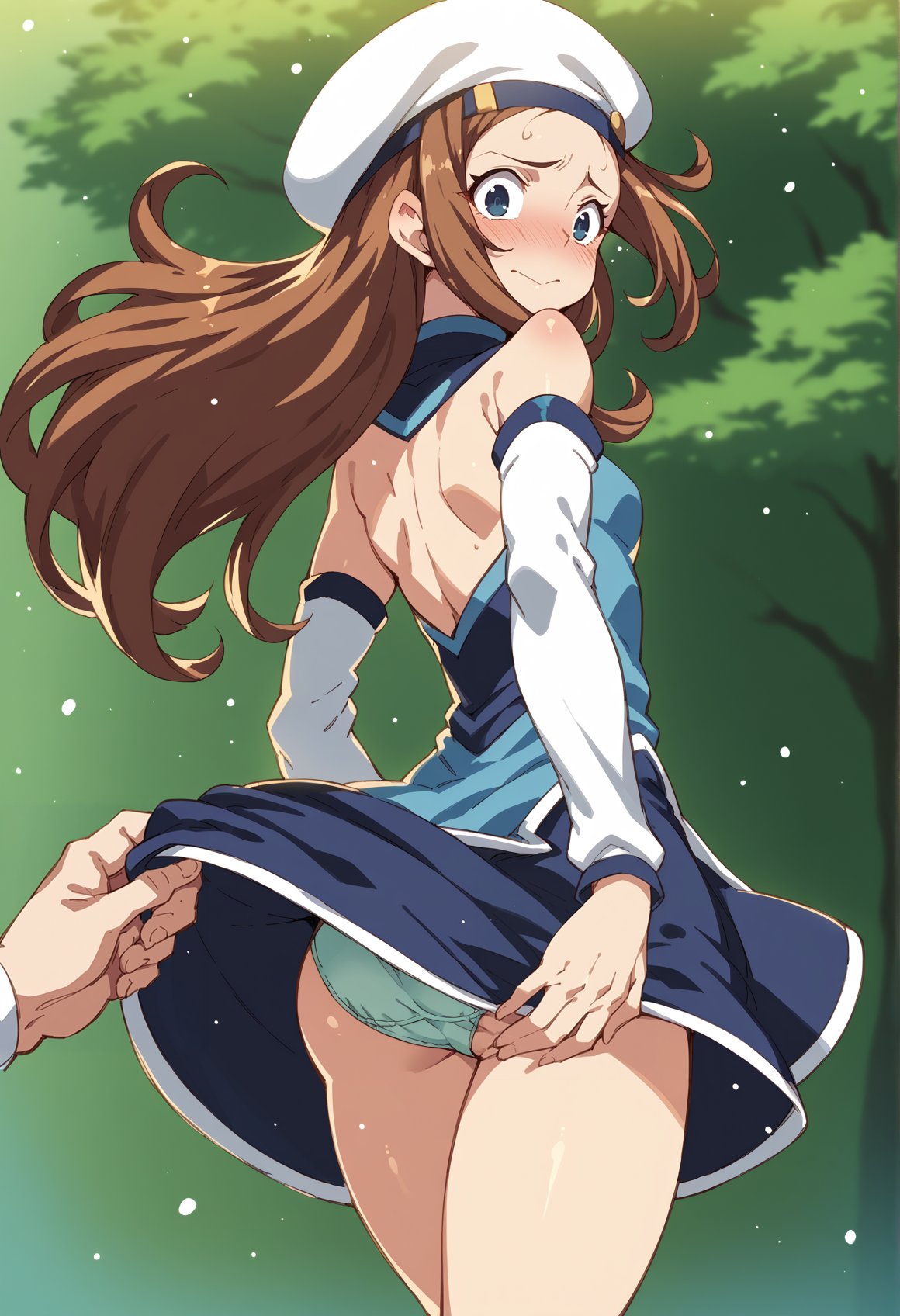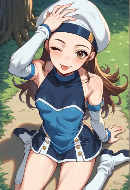 Notable tags: brown hair, long hair, beret, short dress, blue dress, detached sleeves, miniskirt, leg warmers