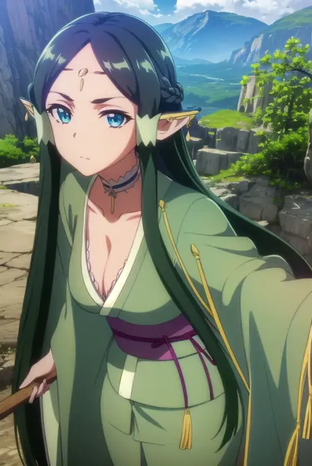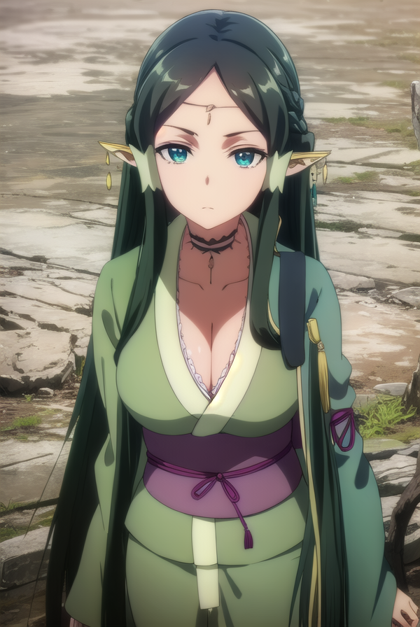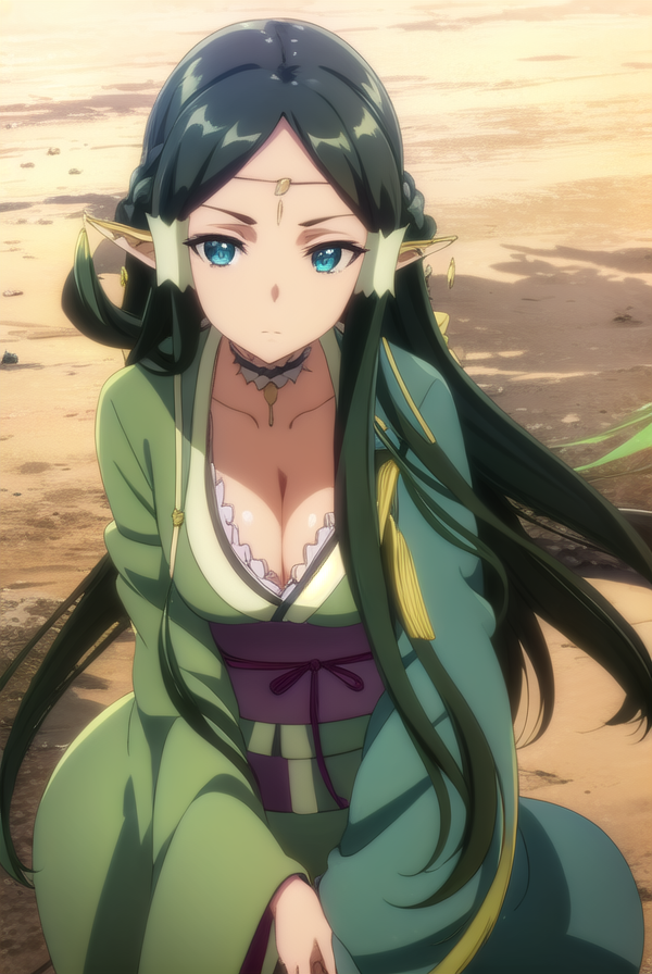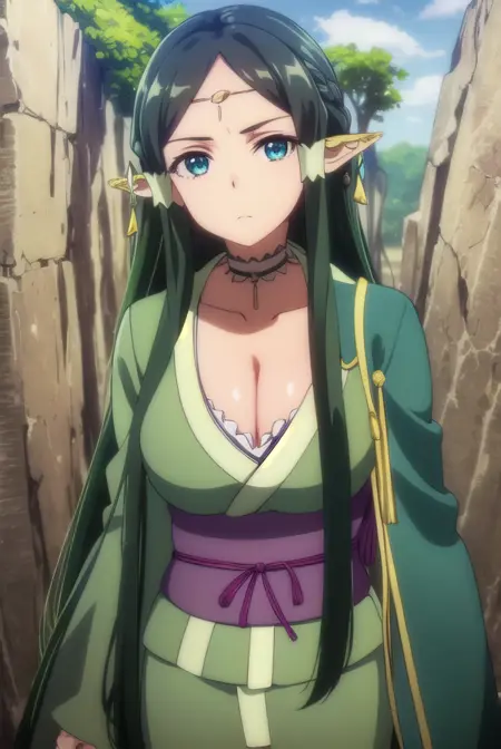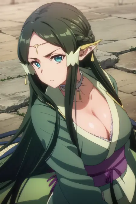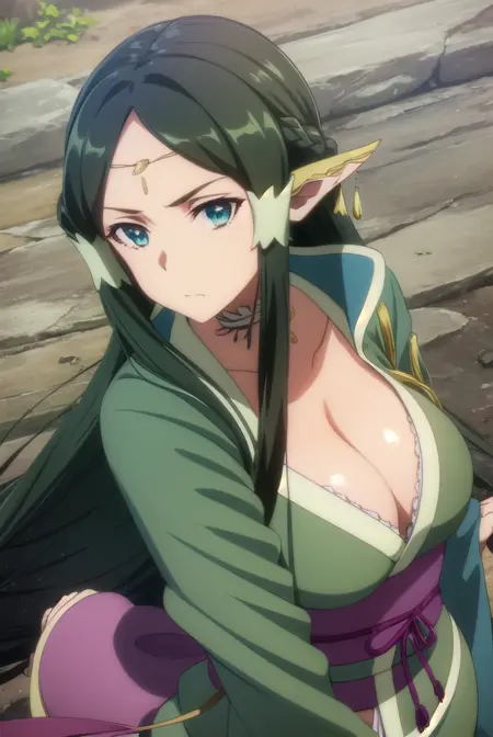 sakuya, long hair, black hair, very long hair, (green eyes:1.3), green hair, pointy ears, hair tubes, elf, ear covers, dark green hair,
