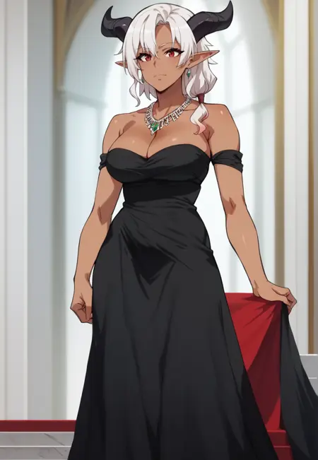 黑色角,白色头发,深色皮肤女性,红色眼睛,尖耳朵,大胸服饰