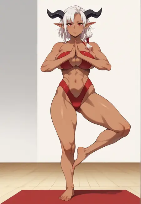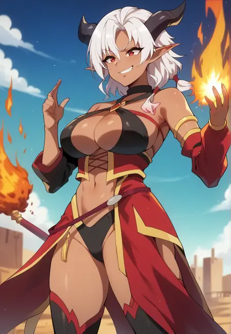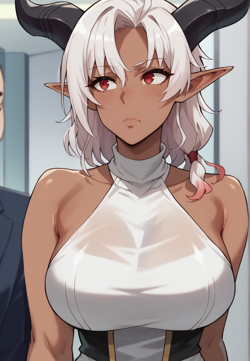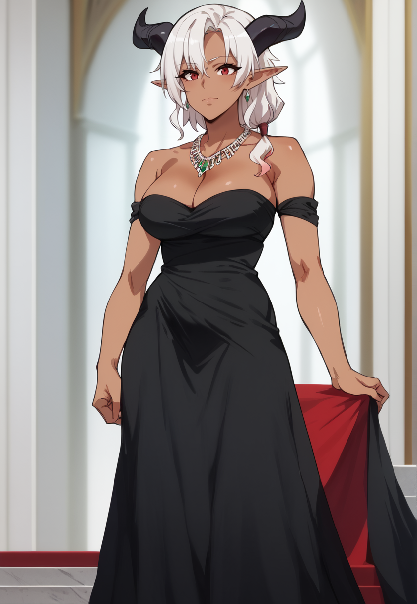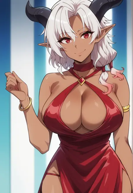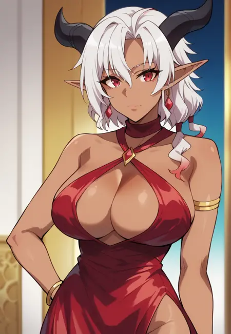 black horns, white hair, dark-skinned female, red eyes, pointy ears, large breastsAttire