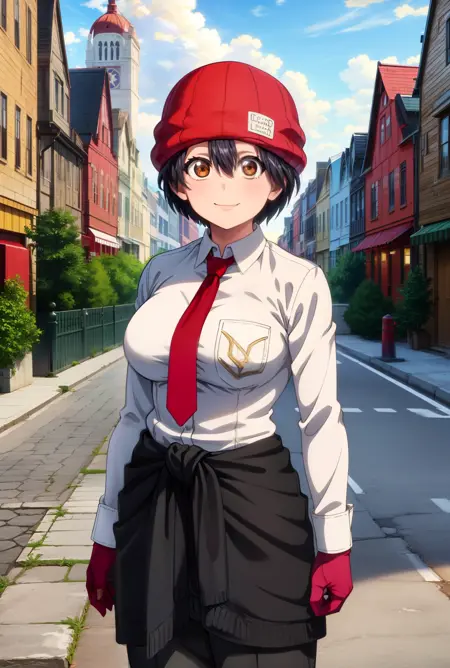 服装2:fuuko_wz,黑发,短发,棕眼,大胸,红手套,红领带,红头饰,红毛线帽,有领衬衫,长袖,黑裤,白衬衫,腰部有衣物