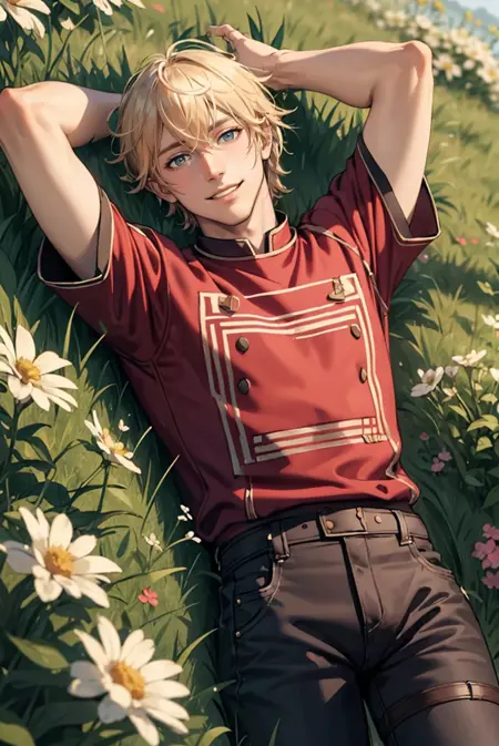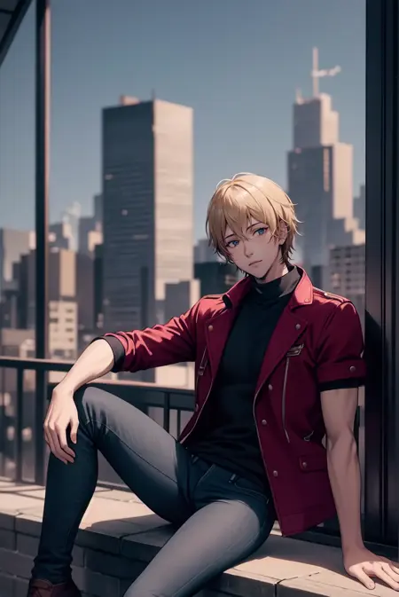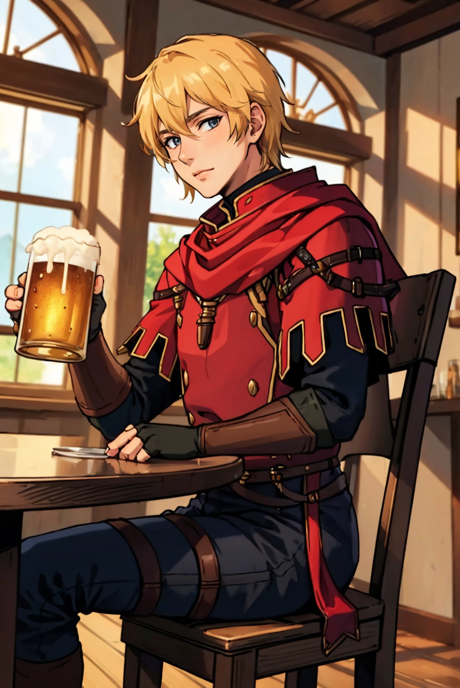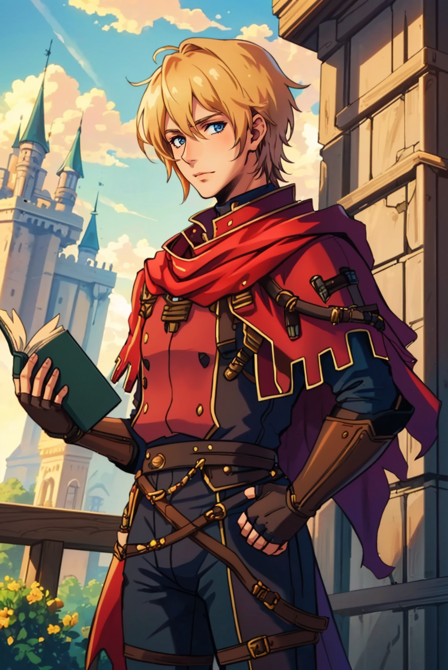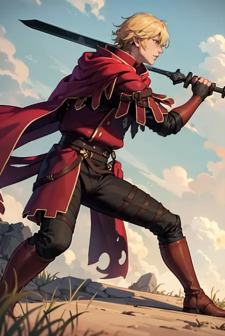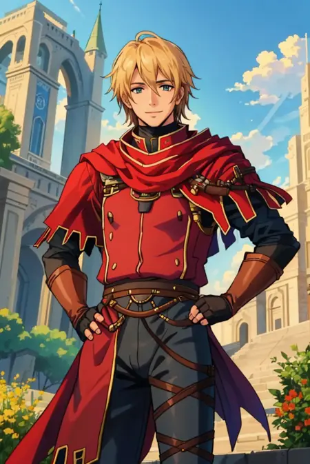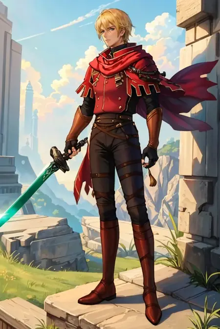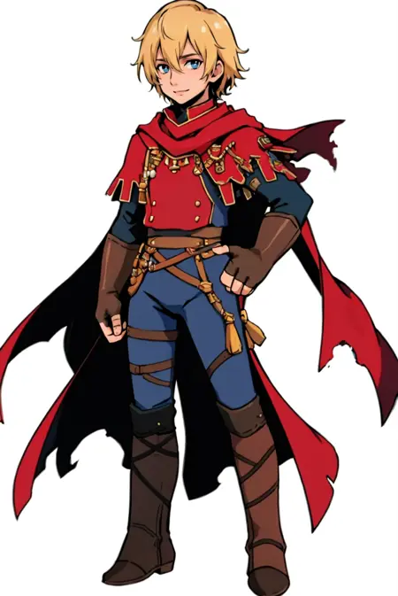 Default appearance: stockerh, red capelet, fingerless gloves, boots