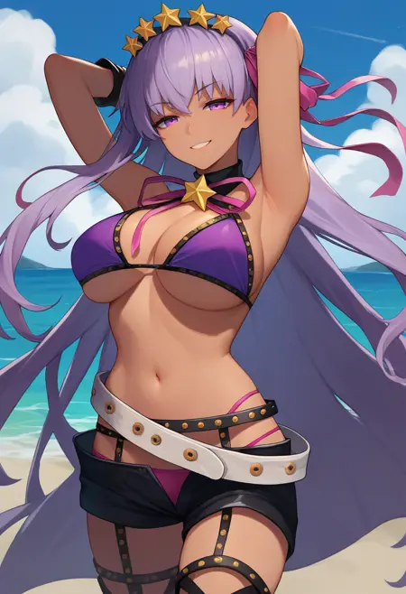 BB 페레 / 문케서스 2단계 상승: bbswimst2, 검은 피부, 머리 리본, 별 머리 장식, 헤어밴드, 보라색 비키니, 손가락 없는 장갑, 검은 반바지, 히어 스타킹, 검은 가터벨트, 흰 벨트, 팔찌