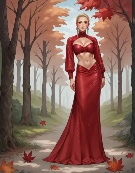 Keywords: HUD_Rd_Seq, (red sequin flower accent crop top), maxi skirt, bare midriff, navel, cleavage, long sleeves, shoulder cover, shrug, long earrings