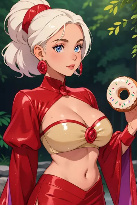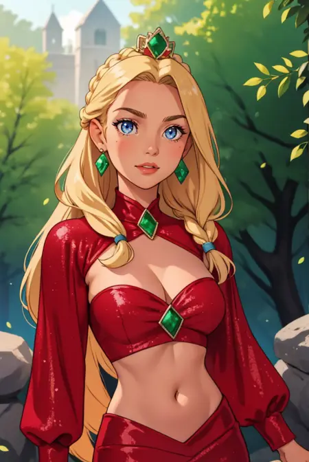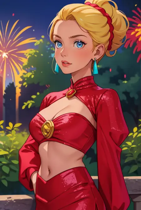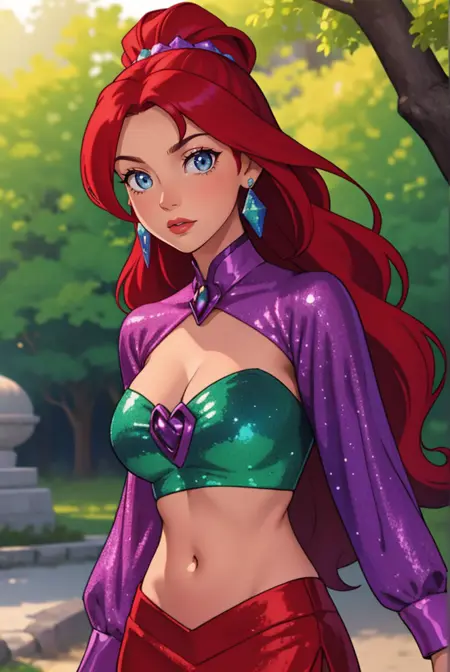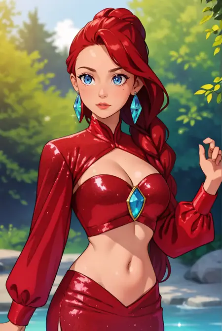Keywords: HUD_Rd_Seq_XLP, red glitter crop top with rosette in the center, red glitter long skirt, bare midriff, navel, cleavage, long sleeves, red glitter shoulder cover, shrug, long earrings