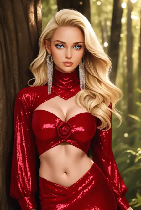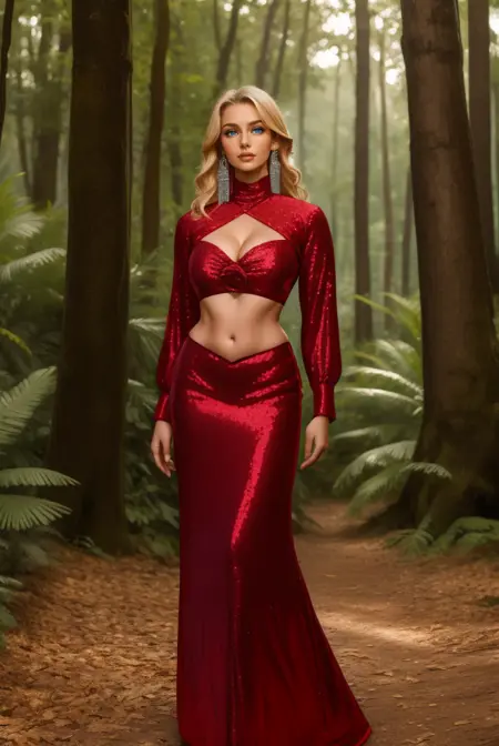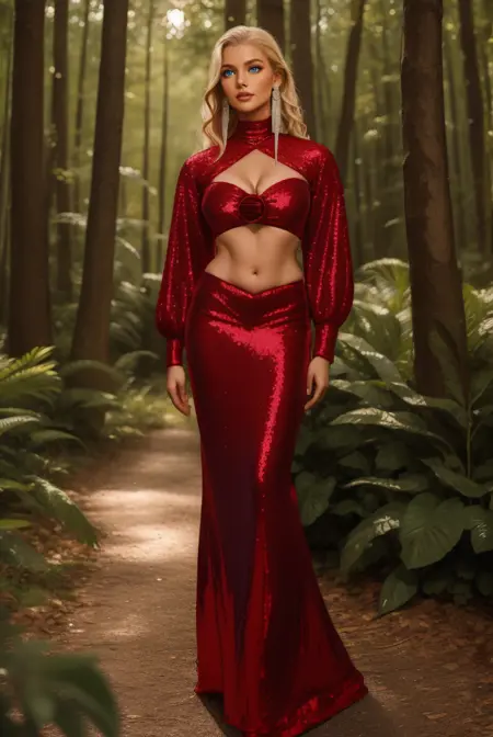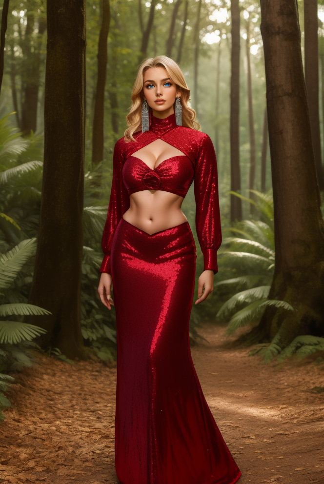 Keywords: HUD_Rd_Seq, (red sequin flower accent crop top), maxi skirt, bare midriff, navel, cleavage, long sleeves, shoulder cover, shrug, long earrings