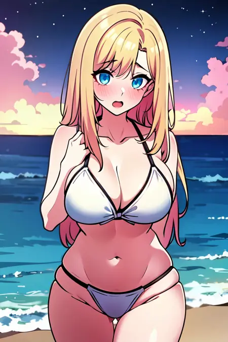 Tags for her look: 1girl, solo, long hair, blue eyes, blonde hair, large breasts,