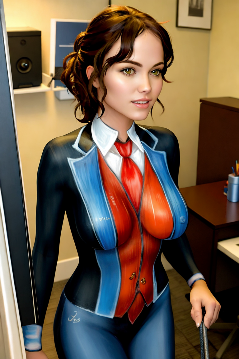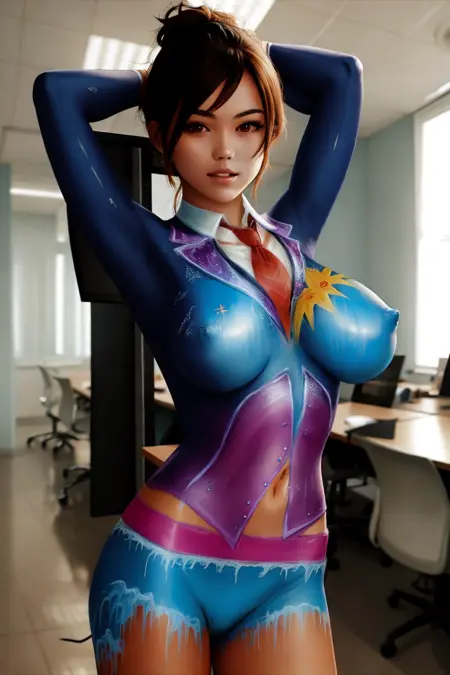 (((Ultra-HD-quality-details))) 1girl, blazer-body-painting, breasts, office, looking at viewerlora:blazer-body-painting:1