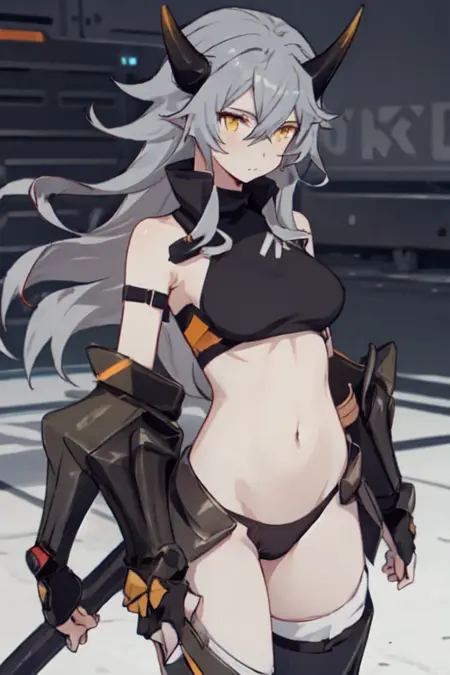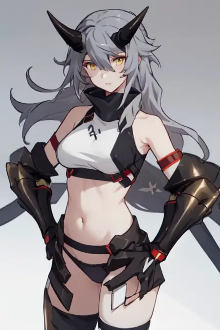 JunNinjaHonkai, 1girl, solo, yellow eyes, long hair, grey hair, hair between eyes, medium breasts, thighhighs, black panties, navel, horns, grey hair, armor, midriff, gauntlets, bare shoulders,