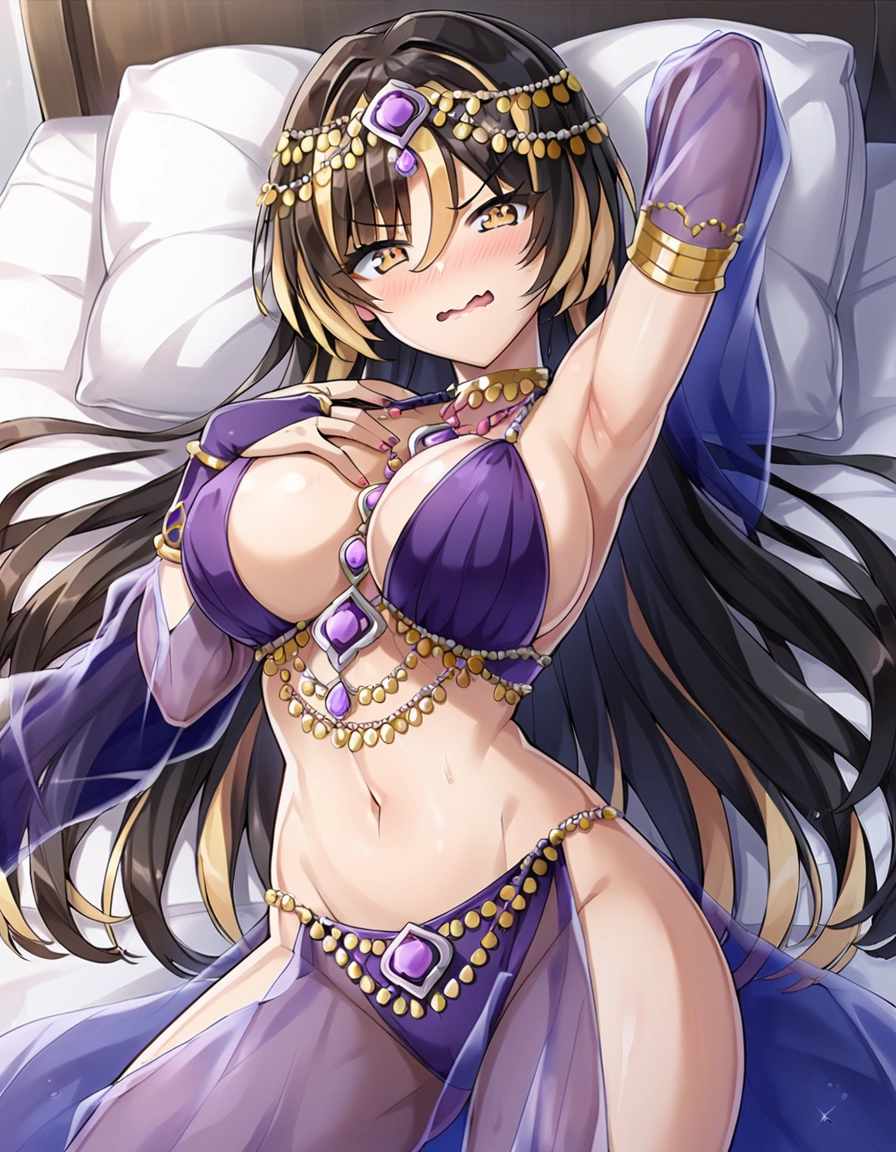 jewelry, harem outfit, bridal gauntlets, circlet, see-through, bare shoulders, pants, revealing clothes, arabian clothes, necklace, between breasts, gold trim, purple gemstone, side slit, purple nails, nail polish,