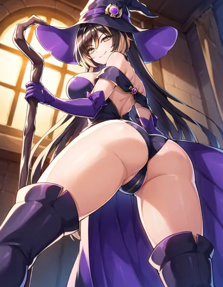 witch, witch hat, off-shoulder dress, purple dress, black panties, zipper panties, staff, purple gloves, navel, cleavage, bare shoulders, purple boots, black choker, holding staff,