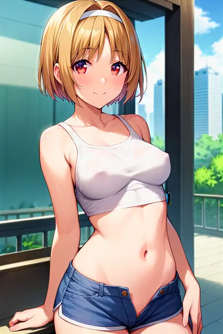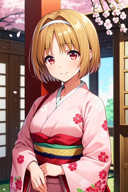 触发词: kushida kikyou, 短发, 发丝飘动, 红眼, 发带,