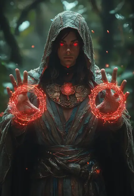 "cinematic shot of a magical woman casting green spell rings, circular glowing rings in each hand, multiple spell rings, jungle in background"