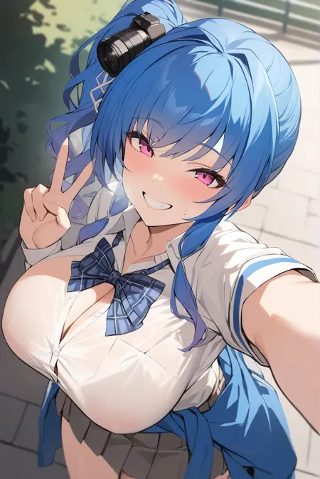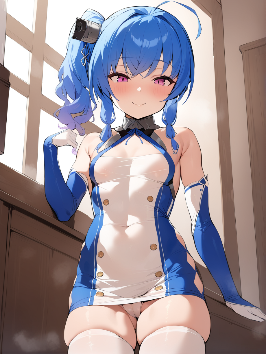 原版(original):st._louis_\(azur_lane\),side_ponytail,blue hair. elbow_gloves, taut_clothes,thighhighs,
