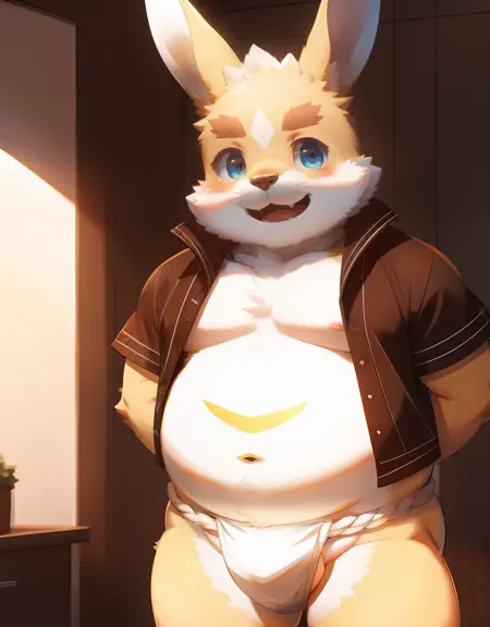 Related words : yellow fur, white fur, two-tone fur, body fur, short hair, yellow hair, blue eyes, closed eyes, thick eyebrows, rabbit tail, rabbit boy, rabbit ears, animal ears, animal nose, snout, glasses, bag, belt, scarf, ascot, open clothes, open jacket, sandals