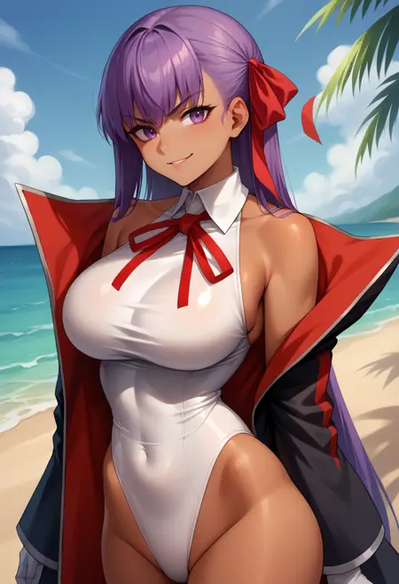 BBSwimsuit, 紫色眼睛, 长发, 紫色头发, 发带, 颈部丝带, 红色丝带, 白色紧身衣, 高开衩紧身衣, 白色手套, 双面外套, 黑色外套, 红色外套, 竖起衣领