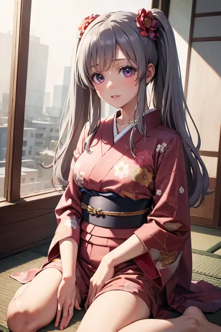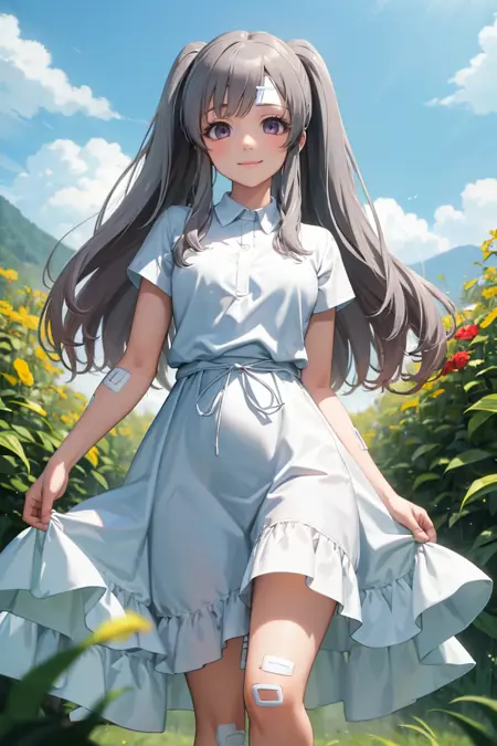KirikoCasual, long hair, twintails, bandaid on forehead, collared dress, white dress, short sleeves