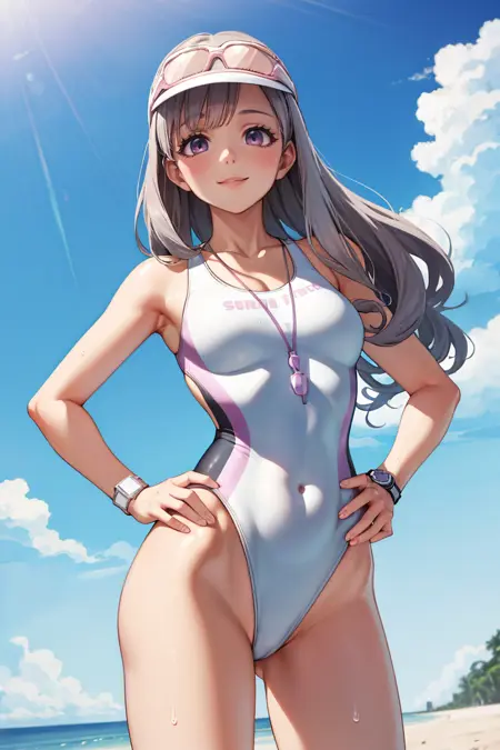 KirikoSwimsuit, long hair, visor cap, white one-piece swimsuit, whistle, wristwatch