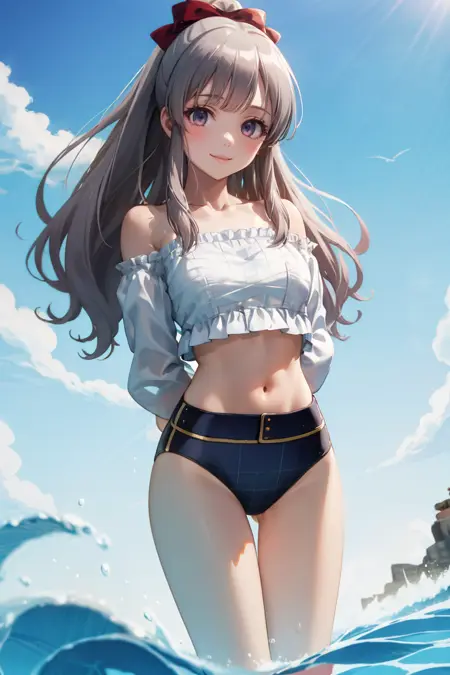 KirikoBikini, long hair, ponytail, hair bow, off-shoulder bikini, mismatched bikini, frills, blue bikini, bracelet