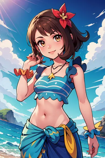 Summer - zzGloria, gloriaSummer, blue sarong, blue shirt, hair flower, jewelry, navel, necklace, official alternate costume