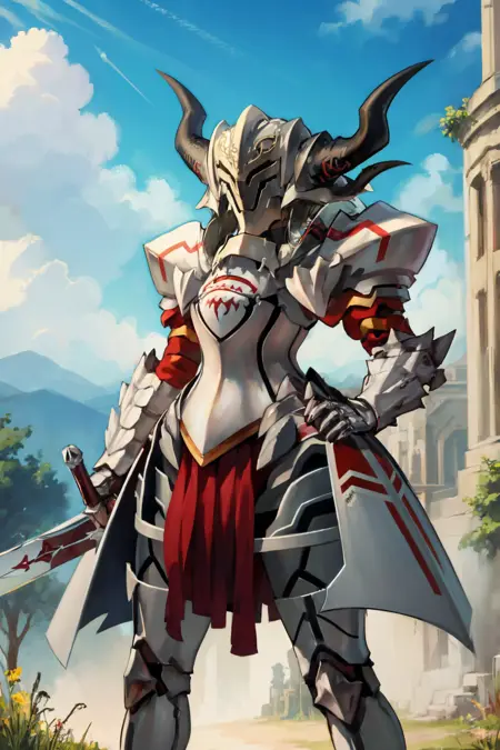 添加 "helmetMord, 带角头盔, 装甲, 全身甲, 肩甲, 手套, 装甲靴" 以获得她戴头盔的全副武装造型。(头盔略有不一致。)