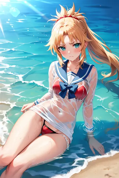 添加 "2ndRiderMord, 马尾辫, 红色比基尼, 水手领, 白色衬衫, 湿透衬衫, 透明, 长袖" 以获得摩德雷德(骑职者)第二次升阶形态。