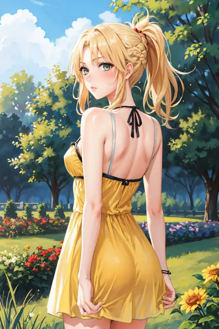 添加 "casualMord, 马尾辫, 项链, 白色吊带背心, 露腹, 红色夹克, 腰带, 短裤, 牛仔短裤" 以获得她的休闲造型。将 "红色夹克" 替换为 "裸露手臂" 以移除夹克。