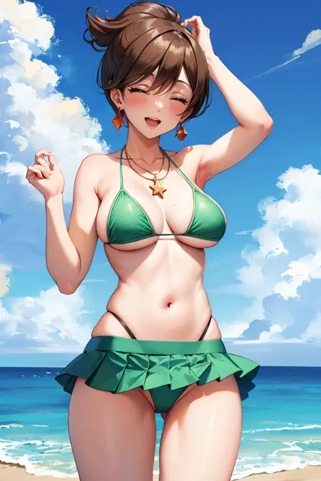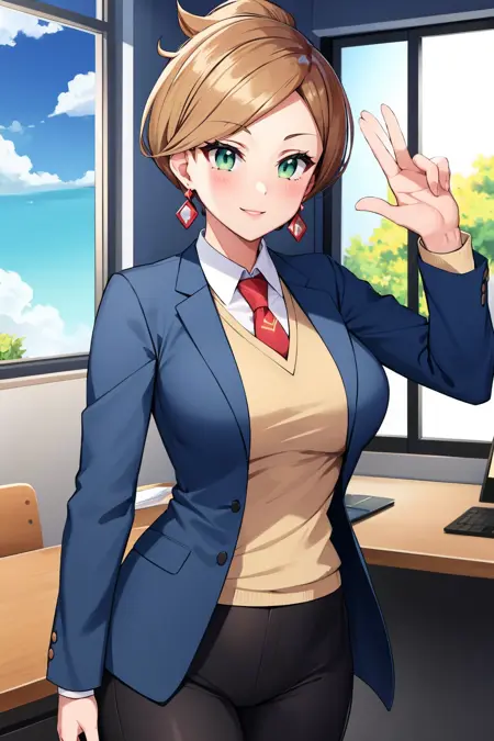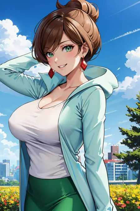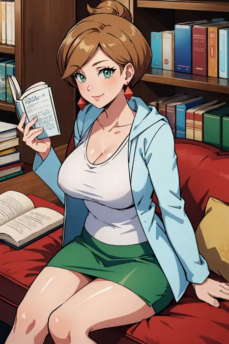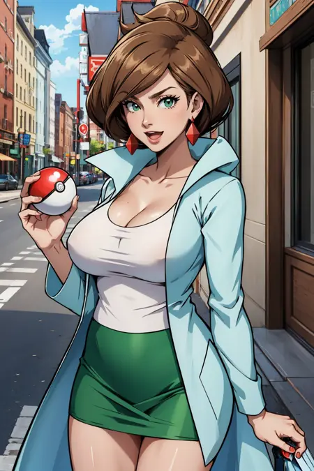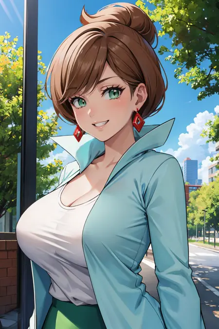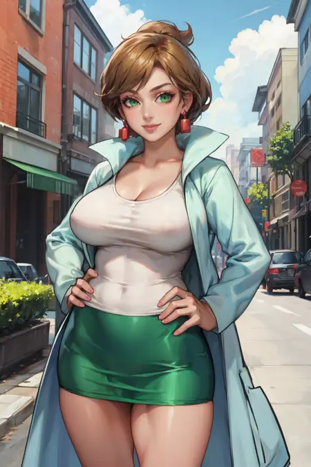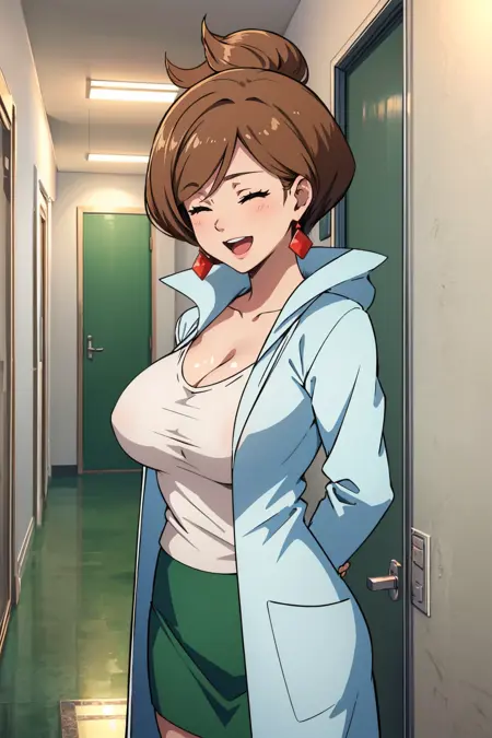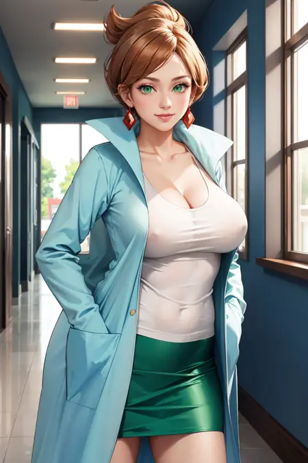 Add "earrings, white shirt, cleavage, labcoat, green skirt" for her typical look.