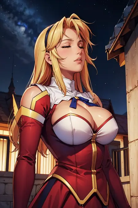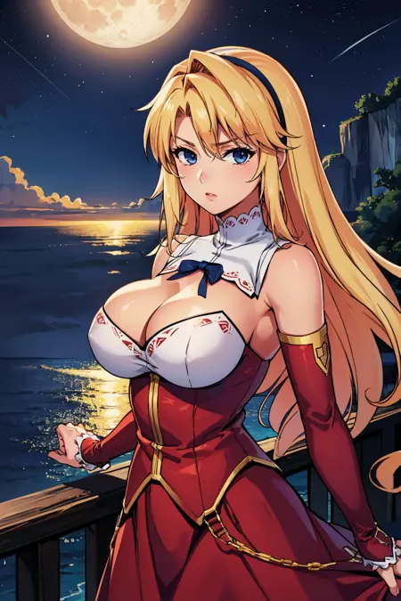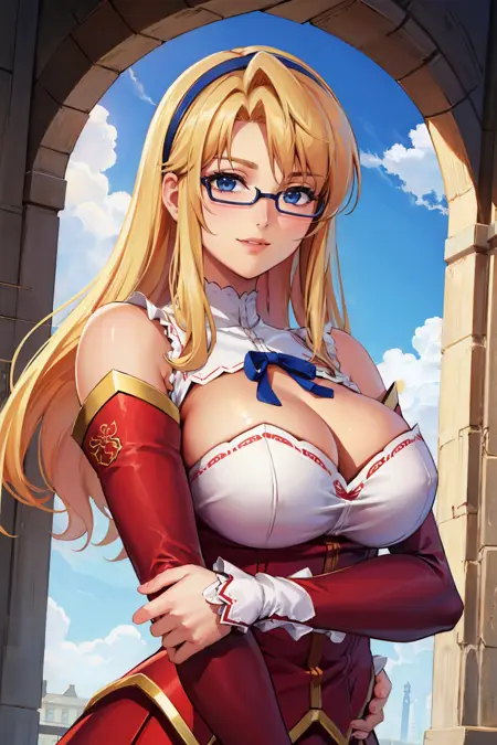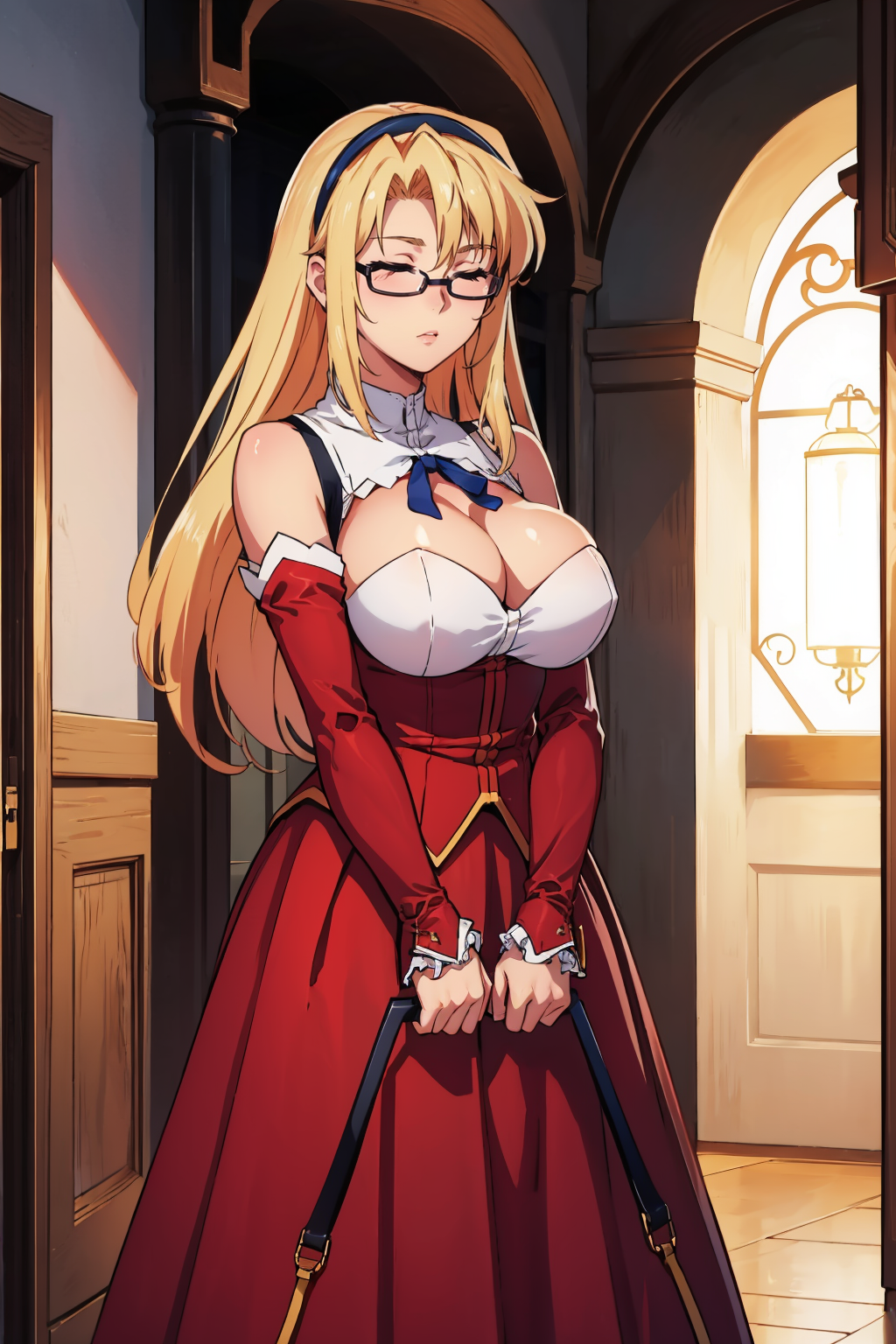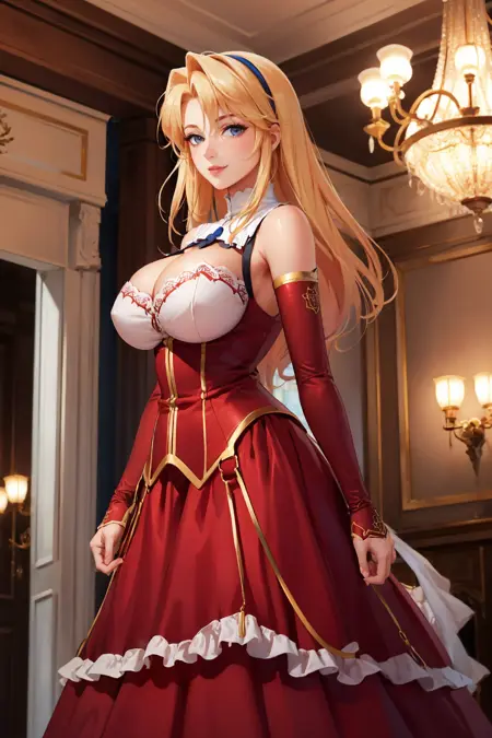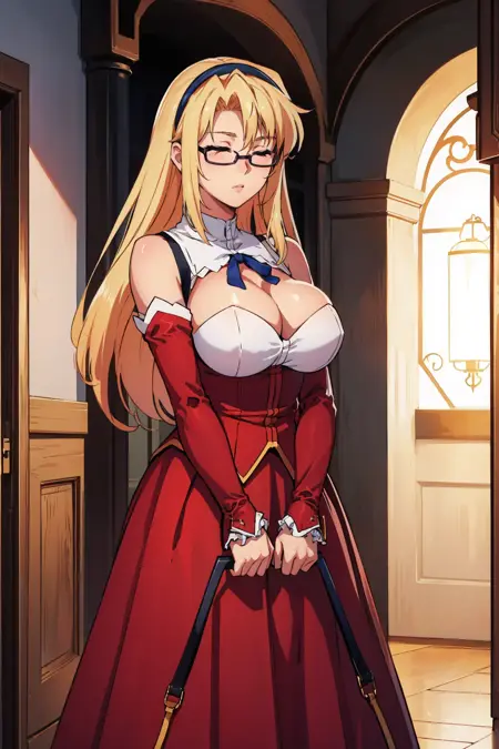 Add "hairband, red dress, cleavage, red sleeves, detached sleeves, frills, long dress" for her typical look.