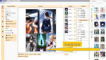 Manga Editor Desu!는 직관적인 조작을 목표로 설계된 경량의 브라우저 애플리케이션입니다. 이미지 드래그 앤 드롭, 파일 선택을 통한 가져오기, Text2Image 기능, Image2Image 기능 등 다양한 기능을 지원합니다. 초보자를 위해 표준적으로 장착된 칸 나누기가 제공되어 간단히 만화를 제작할 수 있습니다. 또한, 전문가용 칸 나누기가 가능한 나이프 도구도 갖추고 있어 자유롭게 칸을 자를 수 있습니다. 기능은 계속 발전하고 있으며 정기적인 업데이트를 권장합니다.