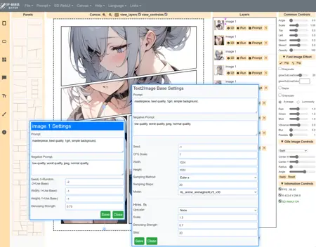 Manga Editor Desu! is a lightweight browser application designed for intuitive operation. It supports a variety of features such as drag-and-drop image import, file selection, Text2Image functionality, and Image2Image functionality. For beginners, it offers pre-equipped panel layouts, making it easy to create manga. Additionally, it includes a knife tool that allows for professional panel layout customization, enabling you to freely cut panels. The features are continuously evolving, and regular updates are recommended.