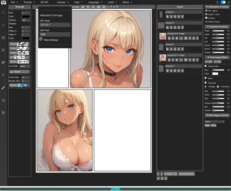 Manga Editor Desu! 是一款为直观操作而设计的轻量级浏览器应用程序。它支持多种功能,如拖放图片导入、文件选择、Text2Image 功能和 Image2Image 功能。对于初学者,它提供预装的面板布局,使制作漫画变得简单。此外,它还包括一款刀具工具,允许专业的面板布局定制,使您可以自由切割面板。功能在不断发展,建议定期更新。