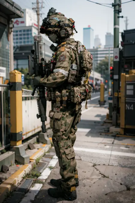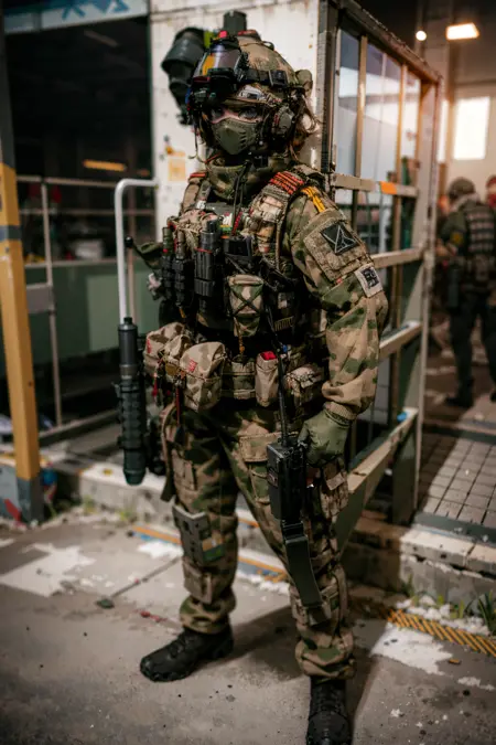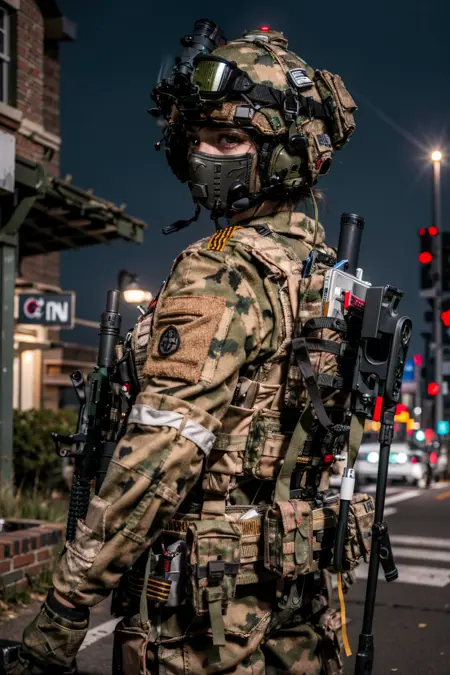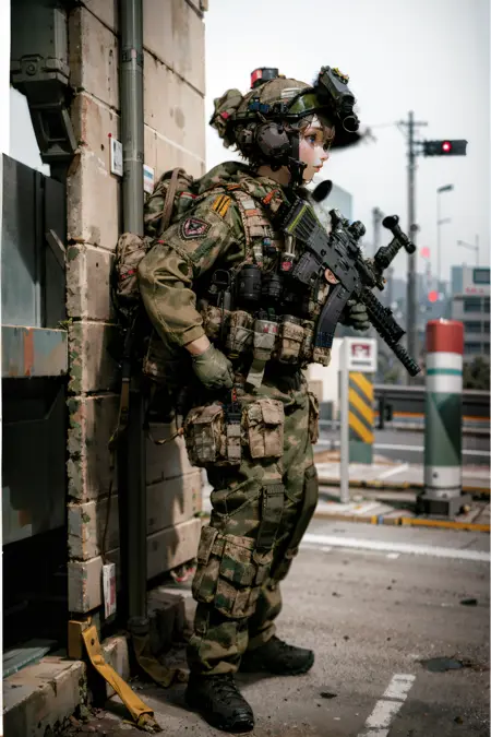 ruanyi0306,bulletproof vest,camouflage,helmet,holding weapon,m4 carbine,military uniform,mask,headset,microphone,