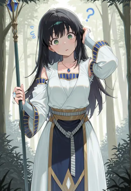 Notable tags: black hair, long hair, pendant, green eyes, white dress, long sleeves, wide sleeves, detached sleeves, bare shoulders, bridal gauntlets,